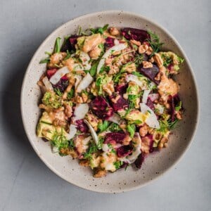 - Assemble the Salad: Layer arugula and cooked farro into a salad bowl or serving bowl. Top with sliced fennel, roasted beets, toasted walnuts, sliced avocado, chopped parsley and dill, and fennel fronds. Drizzle on some dressing and toss to combine.
