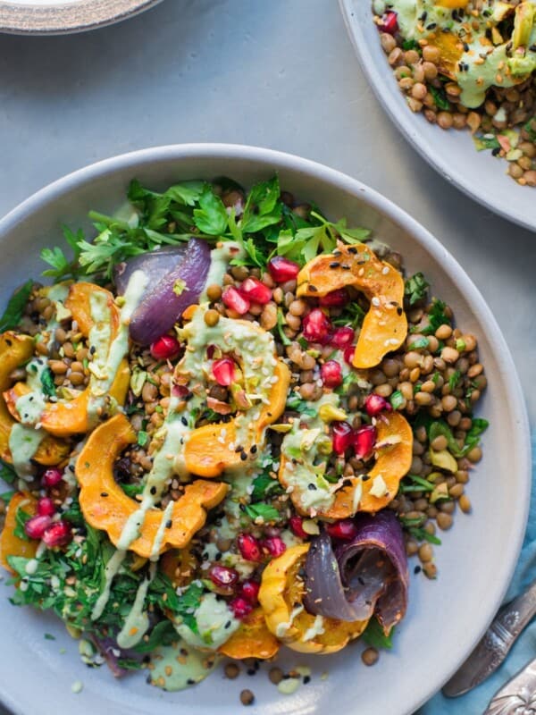 Warm Lentil Salad with Delicata Squash and Cilantro Cashew Cream