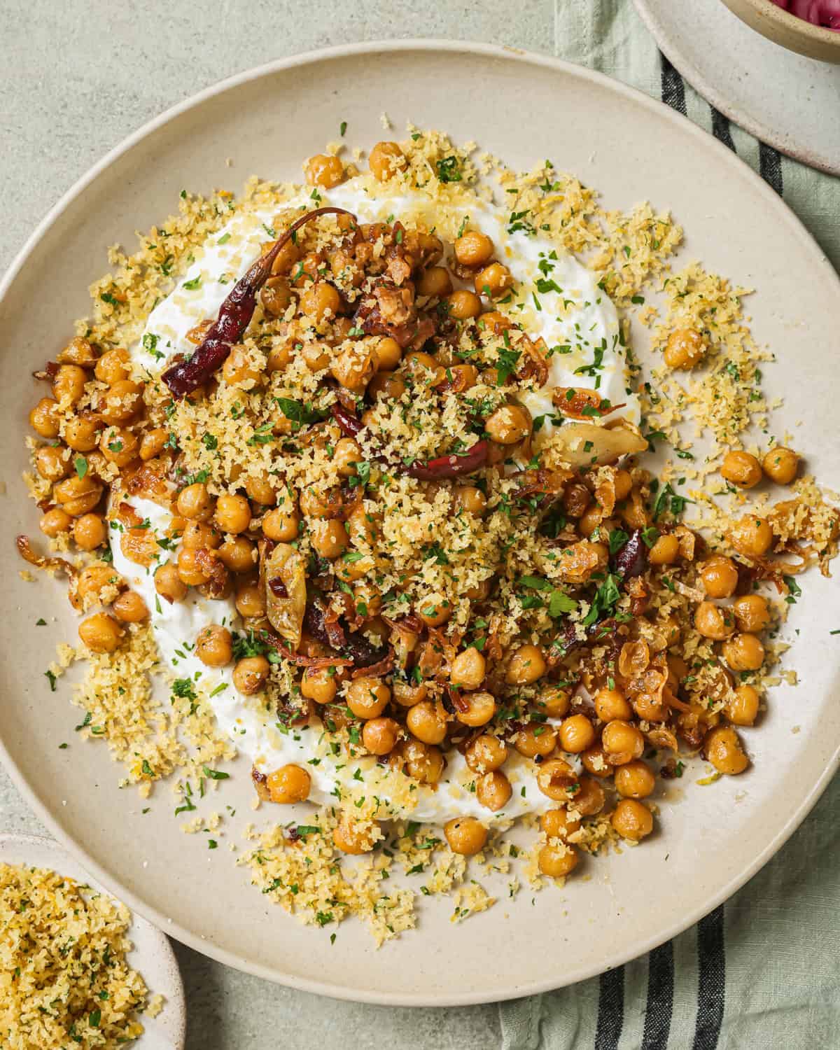 - Assemble: Schmear the yogurt sauce across a serving plate or shallow bowl. Top with the fried chickpeas and sprinkle on the herby breadcrumbs. Dig in with spoons, or if desired, scoop up with pita or crusty bread.