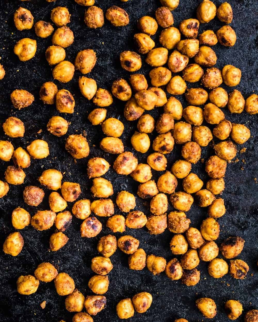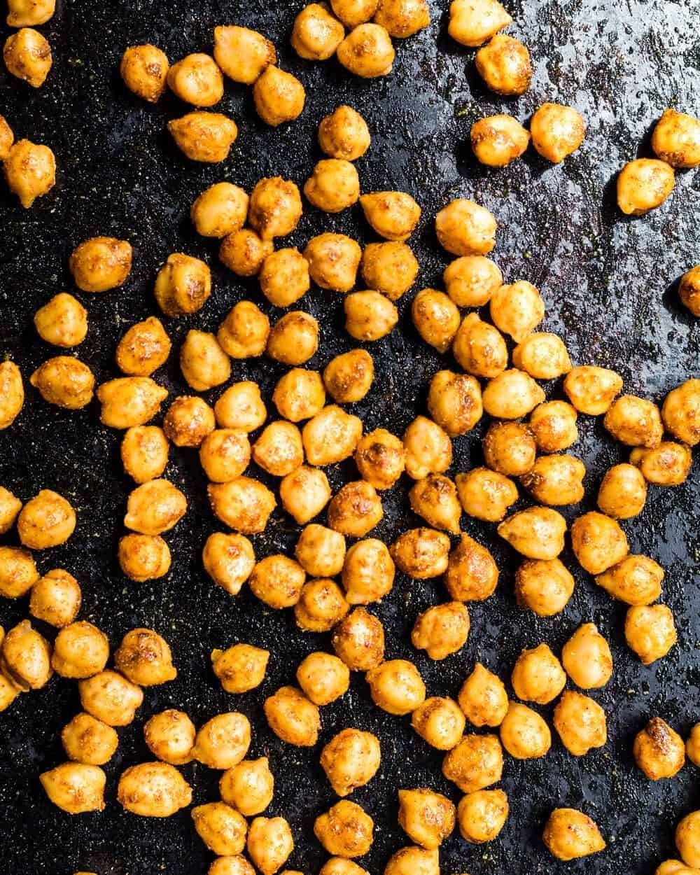 Spread the beans out on a rimmed sheet pan (lined with parchment paper for easy cleanup) and bake at a relatively high temperature 400°F-450°F (204°C-232°C) for 15-20 minutes, or until they’re browned in some spots and sort of crispy and crunchy.