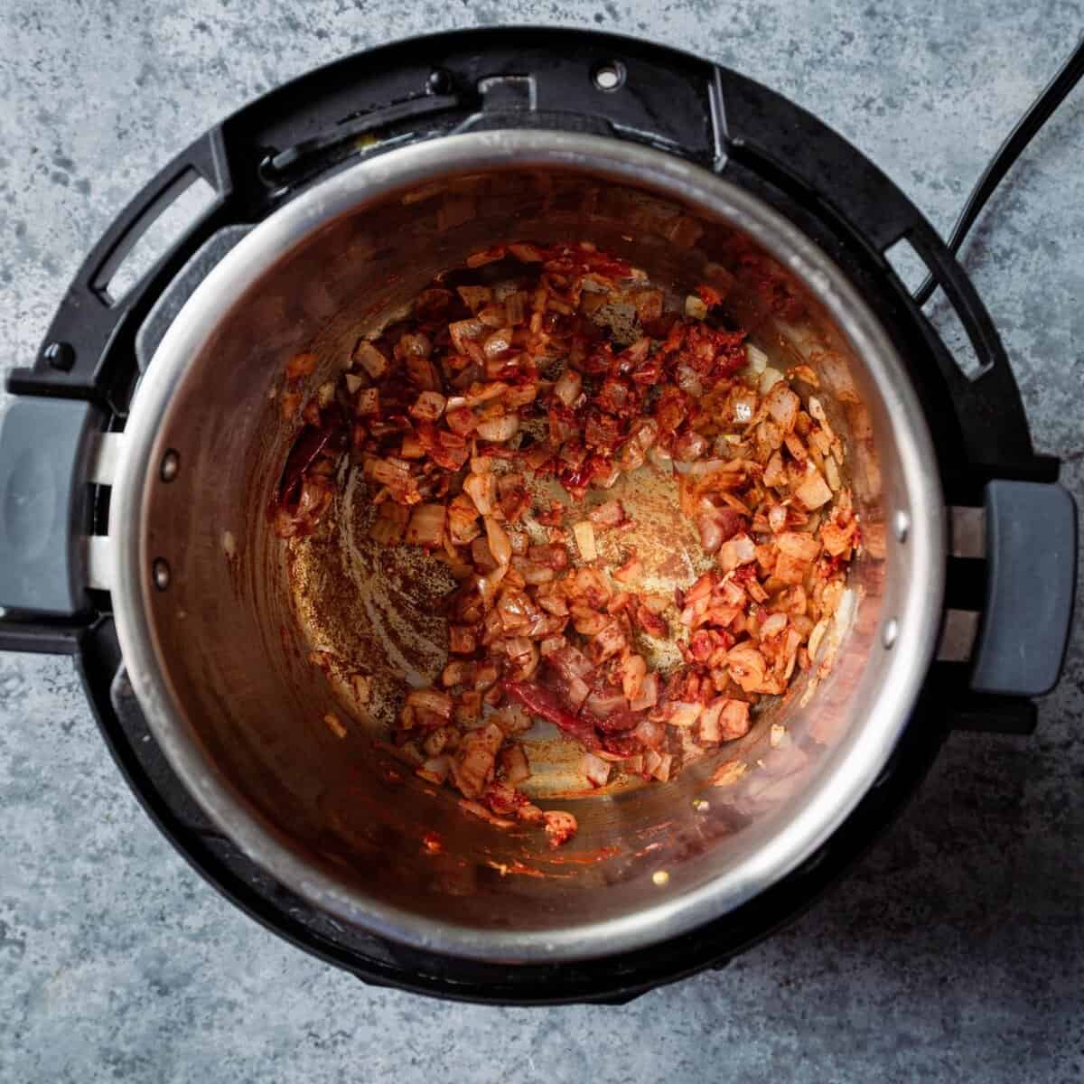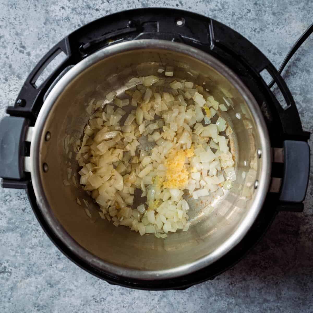 - Select the Sauté setting on the Instant Pot. After a minute or two, add the olive oil. Once the oil is hot, add the onions and cook for 5 minutes, stirring occasionally, until softened and lightly browned. Add the minced garlic and stir frequently for 1-2 minutes.