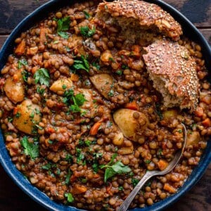 French green lentils are best in this recipe. Unlike regular green (or brown lentils), they hold their shape well when cooked and do not turn mushy. They also have a nice subtle peppery flavor. Some grocery stores sell French lentils, some don’t, so I typically buy a big bag of French green lentils (affiliate link) online and it lasts me a long time (enough to make this soup 9 or 10 times!).
