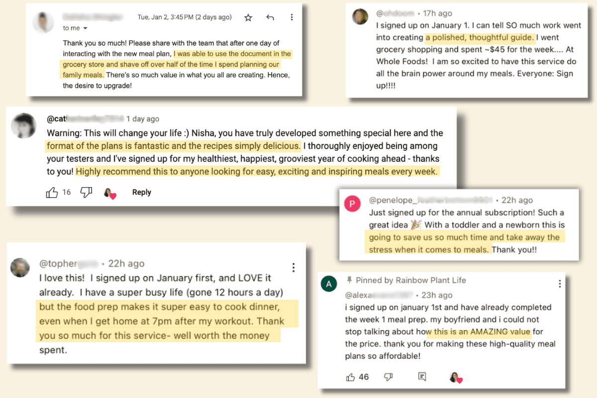 We have noted down your feedback and will definitely discuss it internally as we meet to improve the product. We hope you are still able to enjoy the meal plans. If you have any other feedback or questions, please don’t hesitate to reach out to mealplans@rainbowplantlife.com.