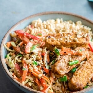 • Serve the veggie slaw over the cooked brown rice and with the baked tempeh pieces on top.