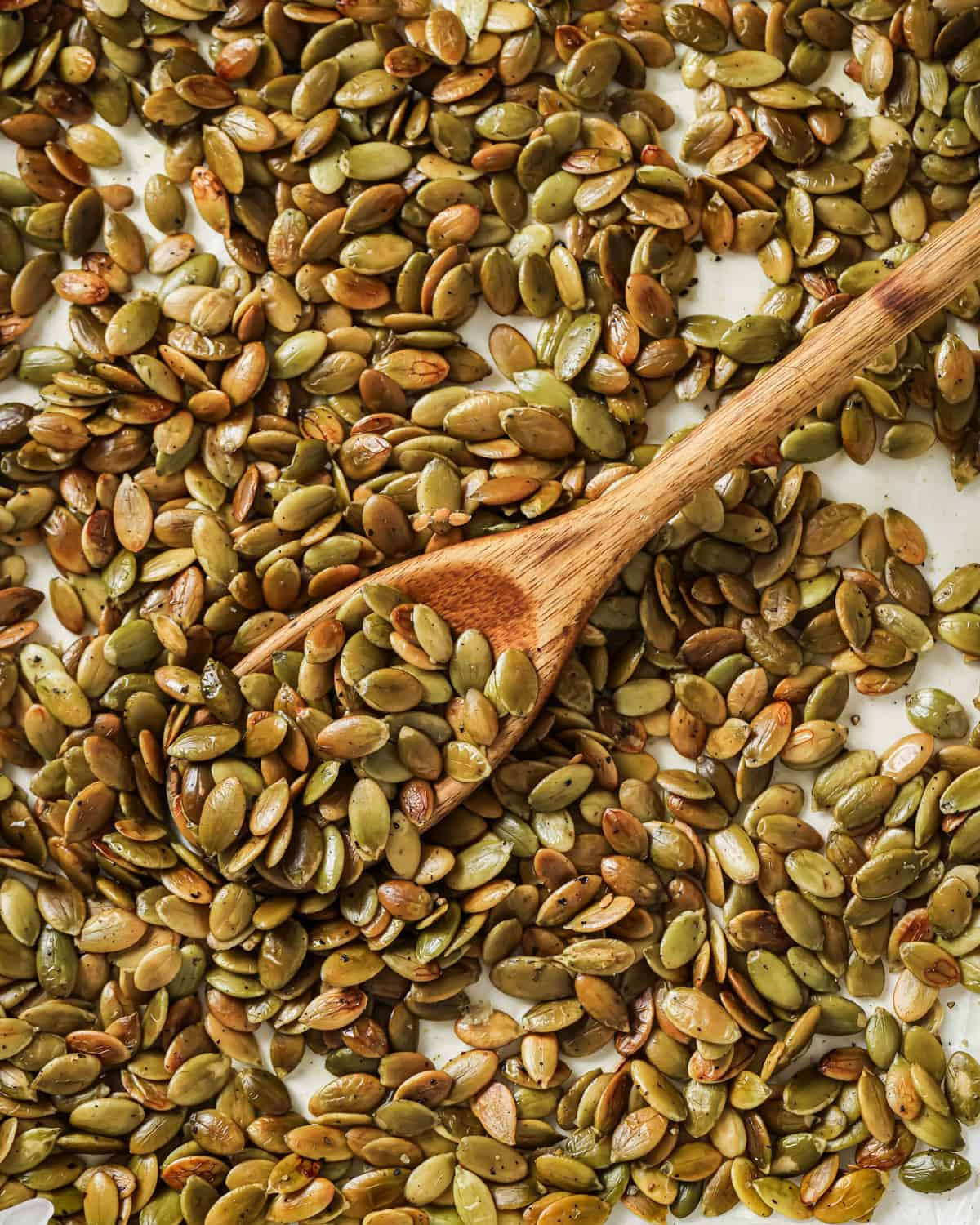 After roasting for the first 8 minutes and tossing, roast for another 5 minutes. From there, it’s best to roast in 2-minute intervals because (1) every oven is different and (2) this helps you get the most evenly browned seeds.