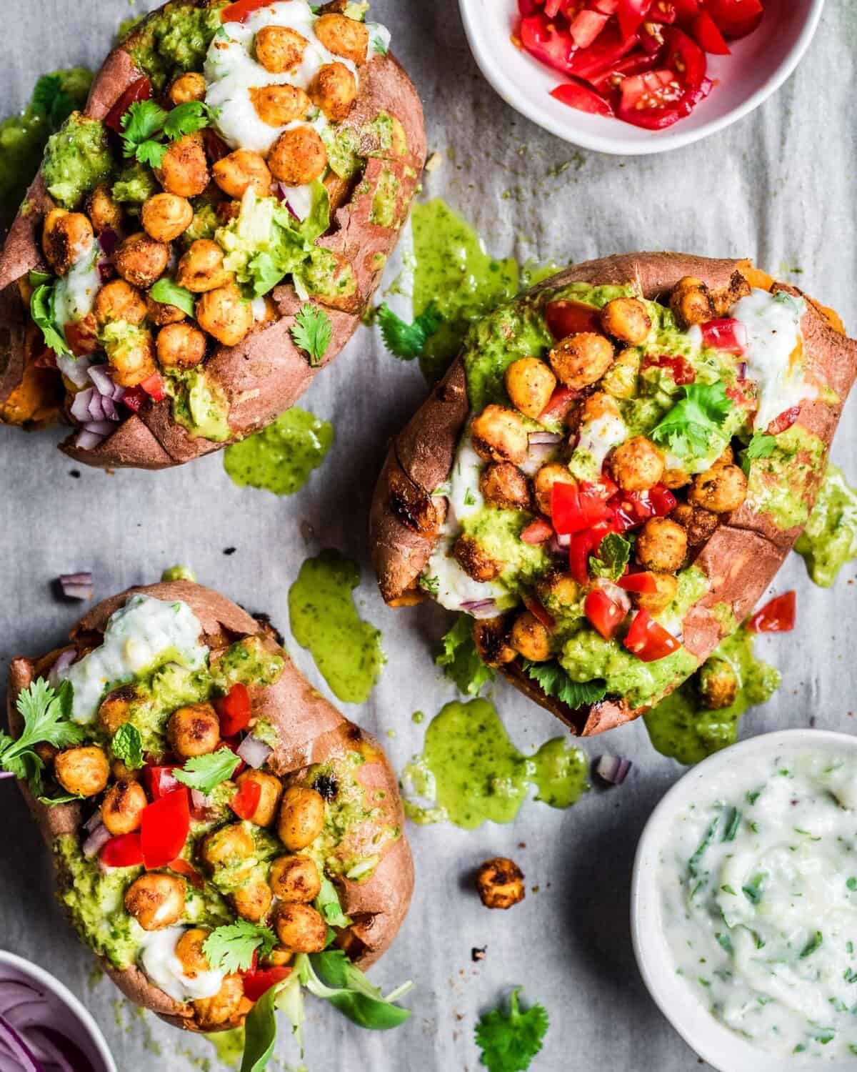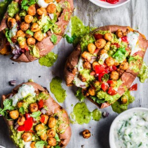 Weeknight friendly. Despite feeling gourmet, this meal is easy enough to prepare on a weeknight if you know how to multitask. Bake your sweet potatoes on one sheet pan in the oven, then add the chickpeas on a separate pan. While those are baking up, make the cilantro sauce (takes 10 minutes or less, including prep time) and the raita (takes 5 to 10 minutes). To save more time, bake the sweet potatoes ahead of time.