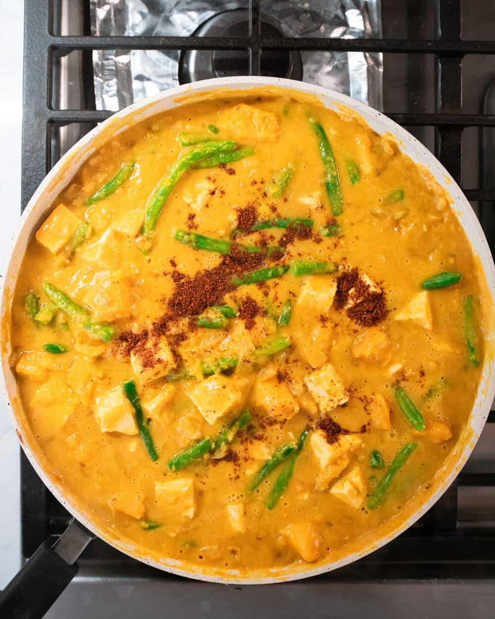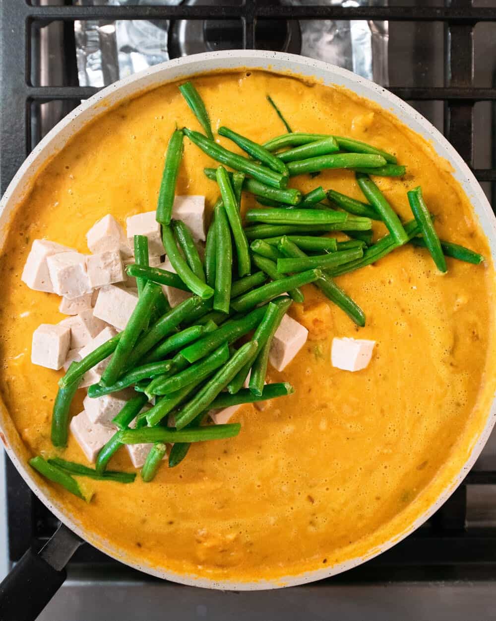 - Bring to a simmer and cook for 4 to 5 minutes, or until the curry starts to thicken. Add in the boiled tofu and gently simmer for another 3 to 4 minutes, or until the green beans are crisp-tender and the tofu is heated through.