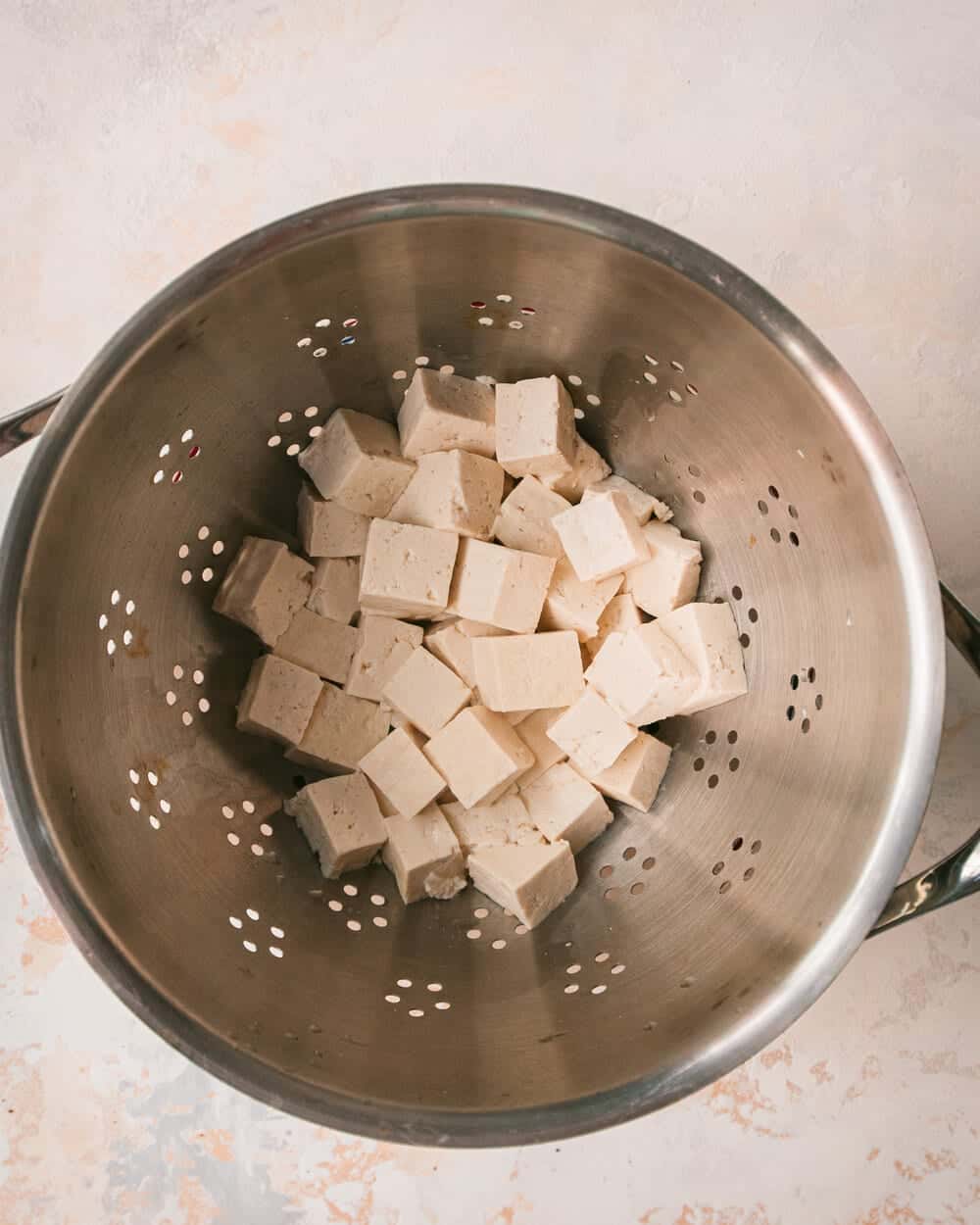 - While the pumpkin is roasting, boil the tofu. Bring a large pot of water to a boil and season with salt. Drain the tofu and pat with paper towels to remove excess water. Chop the tofu into cubes. Add tofu to the boiling water. Once the water returns to a boil, boil for 90 seconds. Use a strainer to remove the tofu from the water and drain immediately, or gently drain over a colander. Set aside.