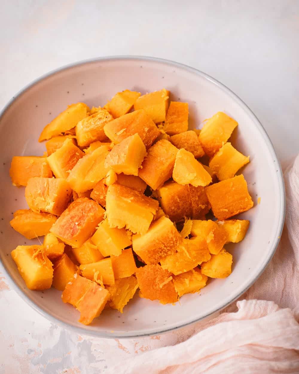 Once the roasted pumpkin has cooled, the skin will be really easy to peel. You can take off the peel, then slice one half into cubes. Or, you can leave the peel on and score the flesh with a knife, then use a spoon to scoop out the cubes.