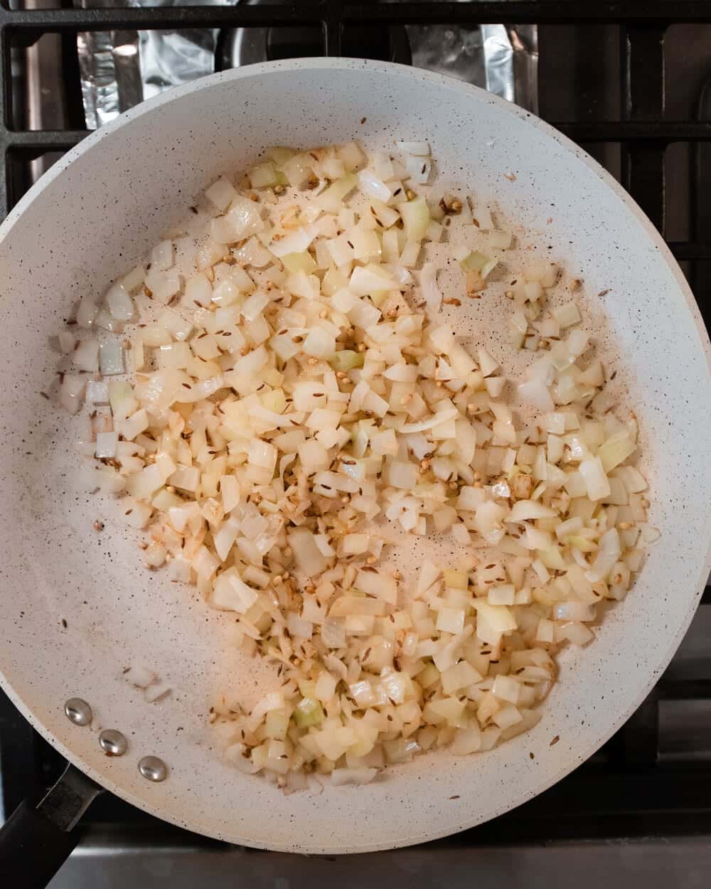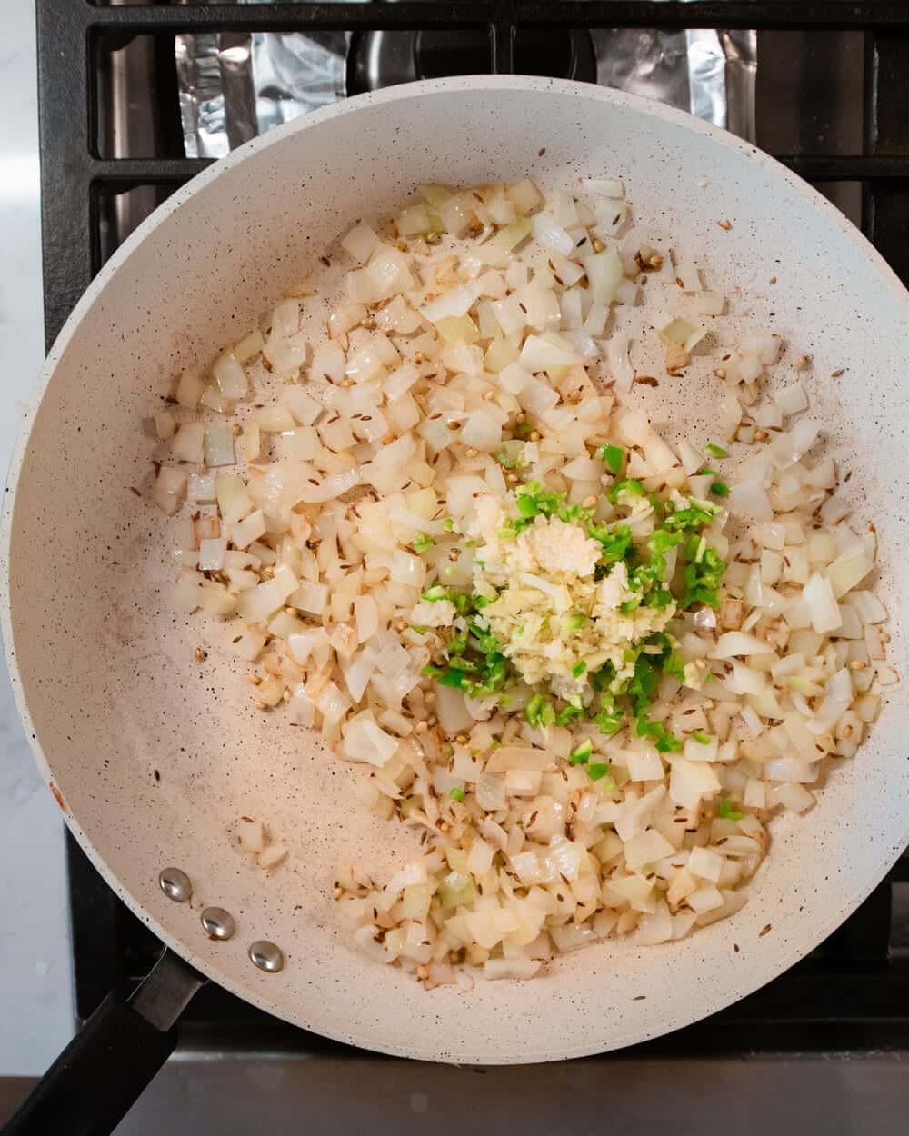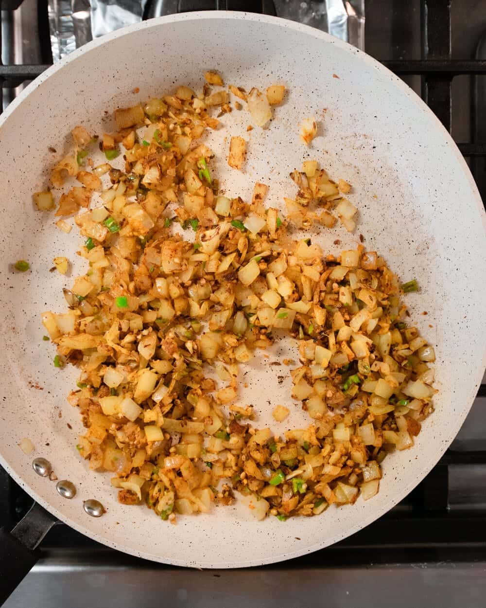 - Heat the same pan over medium-high heat and then add 1 ½ tablespoons of neutral-flavored oil. Once shimmering, add the onions with a pinch of salt and sauté until they just start to turn brown, 4 to 6 minutes. Add the garlic, ginger, green chilies and cook for 1 to 2 minutes, tossing frequently. Add the ground spices—freshly ground or pre-ground cumin and coriander, turmeric, cinnamon, and nutmeg— and cook for 30 seconds, stirring frequently to prevent burning.