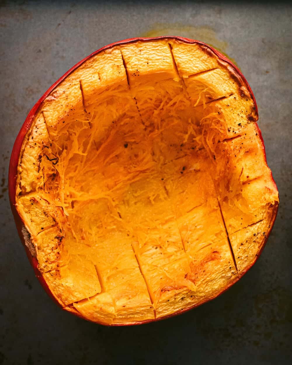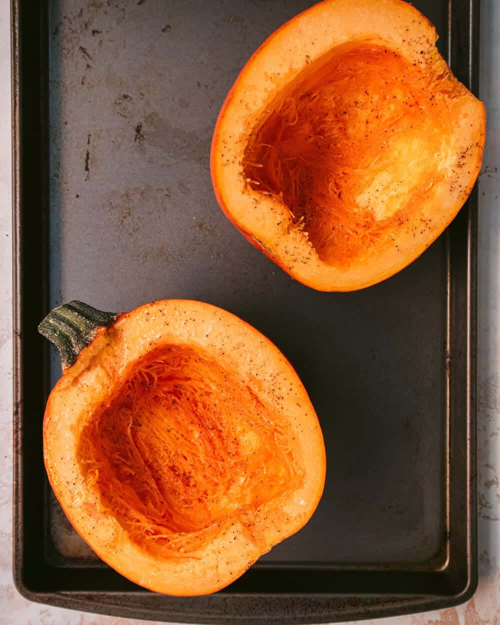 Slice the pumpkin in half and scoop out the seeds using a spoon. Place on a baking sheet and drizzle with oil and season generously with salt and pepper.