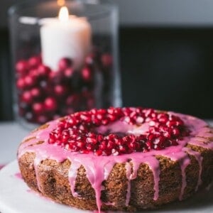 This cake is bursting with warming flavors from the gingerbread spices, which contrast really deliciously with the tart-sweetness of the pomegranate glaze. And it is beautiful and elegant enough to serve as the centerpiece/dessert on your holiday table!