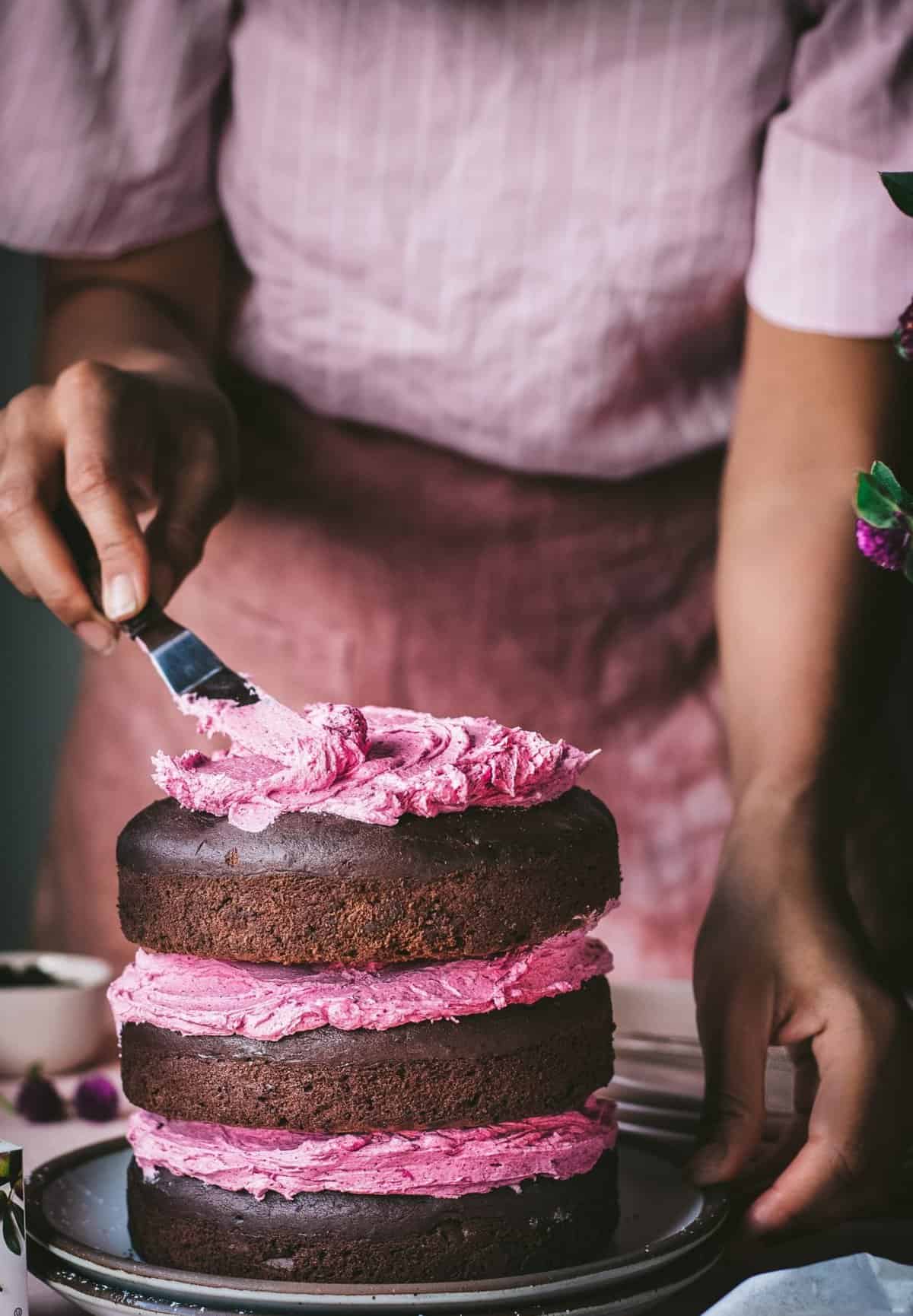 Vegan Chocolate Layer Cake with Hibiscus Frosting